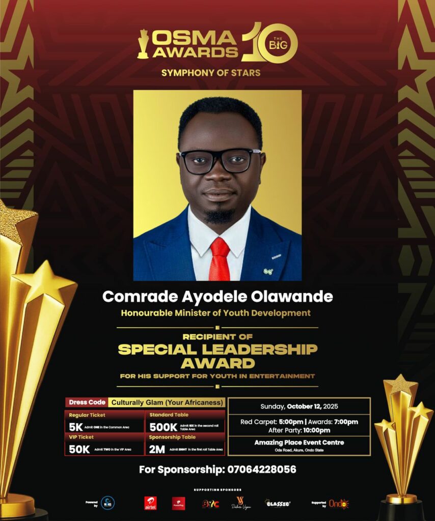 OSMA Award, any of a series of awards presented annually in Nigeria by Mars Promotions (A prolific branding, event and entertainment company) to recognize achievement in the Nigeria music industry. Winners are selected from more than 25 fields, which cover such genres as pop, rap, R&B and gospel, as well as production and postproduction work, including packaging and album notes.Â